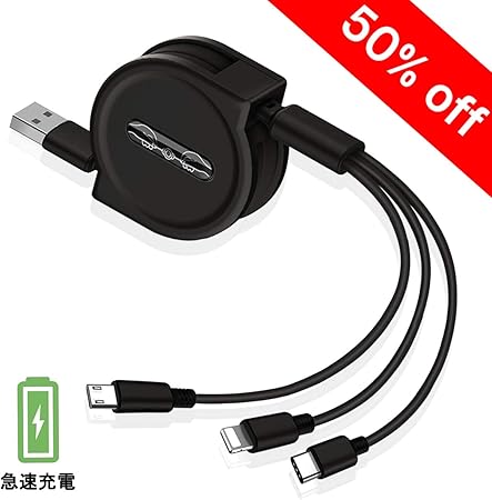 ケーブルがごちゃらない!3in1 巻き取り式充電ケーブル